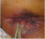 检查时外口常为一乳头状突起或是肉芽组织的隆起,挤压有少量脓液排出,多为单一外口,在肛门附近。也有多个外口,外口之间皮下瘘管相通,皮肤发硬并萎 缩。也有多个外口位于两侧,瘘管成“马蹄形”,直肠指诊在病变区可触及硬结或条索状物,有触痛,随索状物向上探索,有时可扪及内口。若外口不整齐,不隆 起,有潜行边缘,肉芽灰白色或有干酪样稀薄分泌物,应怀疑为结核性肛瘘。