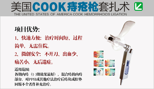 COOK枪套技术:是目前国际上高效的套扎技术,采用天然橡胶套扎环,以0.1MPa的压力不间断吸引病灶处,在极短时间达到吸引部位组织分离、坏死、干结、继而脱落,当痔疮脱落的瞬间压力吸引自动停止,该技术整个过程不用开刀、并具有定向性好、治疗时间短、出血少、安全可靠、无后遗症和并发症等特点。