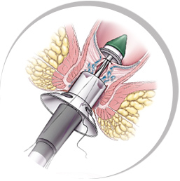 利用特制的圆形吻合器经肛门插入直肠,环形切除直肠下端肠壁的黏膜和黏膜下层组织,并在切除同时进行吻合,使脱垂的肛垫上提,恢复肛垫的正常解解剖位置,起"悬吊"作用,同时切断供应痔核的动脉血液分支,起"断流"作用,从而达到**的目地。